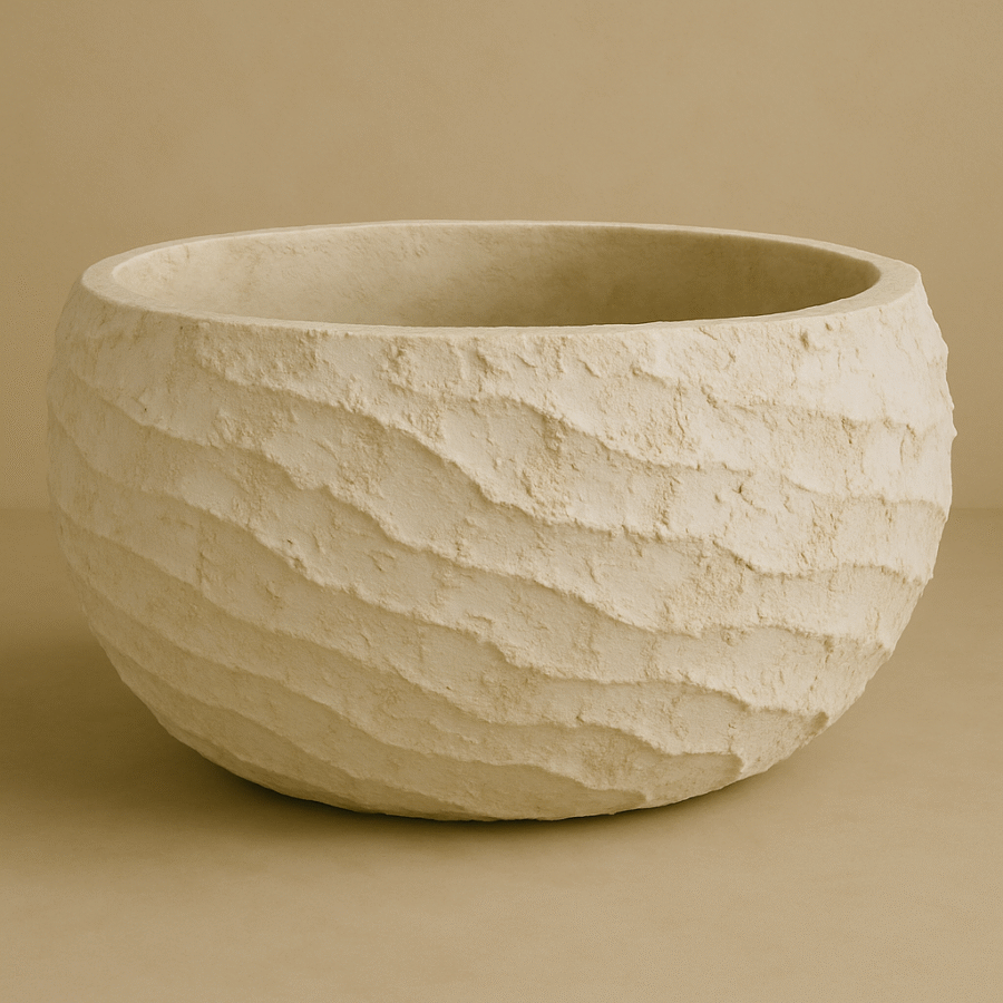 Luma trägt eine weiche, fast poröse Oberfläche mit sanften, rhythmischen Vertiefungen. Sie erinnert an vom Wind geformte Landschaften oder ausgetrocknete Erde – still, rau und zugleich voller Ausdruck. Die helle Farbgebung bringt ein Gefühl von Leichtigkeit und Weite. Pflanzen scheinen darin wie aus einem natürlichen Ursprung heraus zu wachsen. Luma entfaltet ihre Wirkung besonders in ruhigen, offenen Räumen – als zurückhaltendes, aber bestimmendes Gestaltungselement.